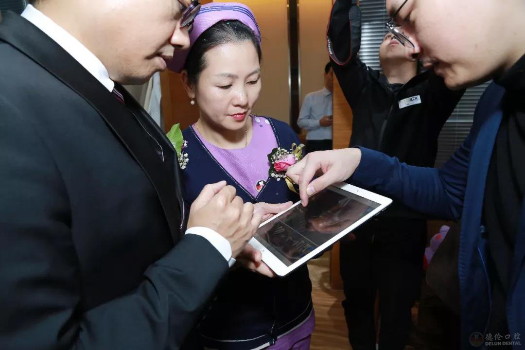 图:德伦口腔医务人员向黄晓嘉先生展示数字化导板,德伦口腔会将导板赠与完成数字化舒适种牙的患者