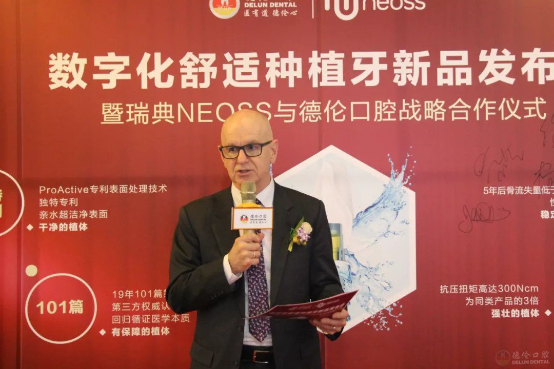 2019年12月18日,德伦口腔数字化舒适种植牙新品发布会暨瑞典NEOSS与德伦口腔战略合作仪式在德伦口腔东风总院盛大举行,瑞典NEOSS亚太副总裁JOHN教授、NEOSS中国事业部市场部总经理徐跃先生、NEOSS尼奥斯华南区负责人陈昌亮先生、德伦口腔牙周种植科主任兼集团牙周技术总监、德伦口腔东风总院口腔外科罗朝阳主任、德伦口腔集团护理部吕金英副主任、德伦口腔东风总院种植科陈医生等嘉宾出席了本次活动。