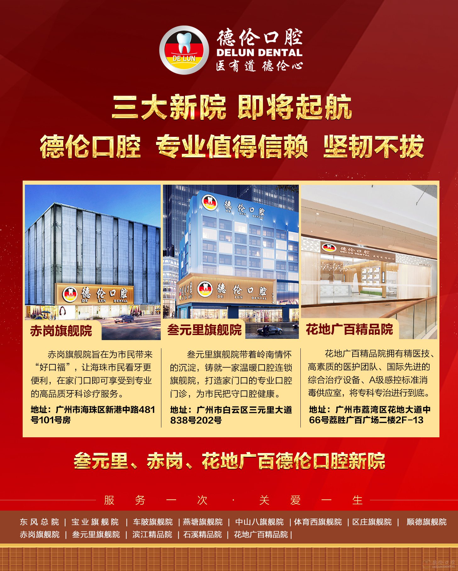 2020年,德伦口腔三大旗舰新院——叁元里、赤岗、花地广百德伦口腔新院,即将盛大启航!届时,德伦口腔将实现双城十三院,市民看牙更为便利,在家门口即可享受到专业的品质牙科诊疗服务。